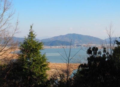円山頂上からの西の湖方面の眺め。見晴らしのよいこの場所に石積みの構造物があります。琵琶湖畔最大の内湖であった大中の湖(だいなかのこ)や小中の湖(しょうなかのこ)の水域とヨシ帯が、かつては眼の前に広がり、四百数十年前には対岸に安土城が建造される様子が見えていた場所です。子どもの頃の遊び場であったという地域の方と話しながら歩き、地域資源に気軽に触れる機会を通して持続可能な暮らしを考えるヒントを得られればと考えています。