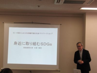 はじめの講演では、中澤静男氏(奈良教育大学 次世代教員養成センター)から、環境・経済・社会の多様な課題は相互に連関しており、また、地域の課題は地球規模の様々な課題とも関係していることから、SDGs達成に向けた取組は身近なところから始められるというお話をいただきました。「SDGsは自分には縁遠い」と思っていた状態だったのが、「日常の暮らしや仕事での行動の選択が持続可能な暮らしに結びつく」という気づきが生まれ、参加者のSDGsへの感覚的な距離はぐっと縮まったようです。