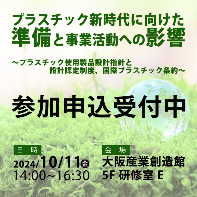 <概要> 海洋プラごみ問題の深刻化を受け、プラスチック使用に対する国内外の動向について学び、これからのビジネスについて考えます。国際プラスチック条約*の合意内容見込み(2024年12月頃)や国内の法令等への影響(プラスチ … 続きを読む プラスチック新時代に向けた準備と事業活動への影響~プラスチック使用製品設計指針と設計認定制度、国際プラスチック条約~