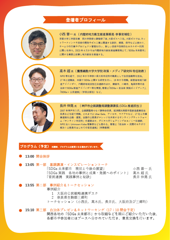 また、関西の「SDGs未来都市」から、各地域の取組を紹介いただくほか、新たな価値の創造・共創のきっかけとなるよう、成功事例や課題について参加者も交えて意見交換し、官民連携による地域の活性化・課題解決につなげることができる場(ネットワーキング会)を設ける予定です。是非ご参加ください!