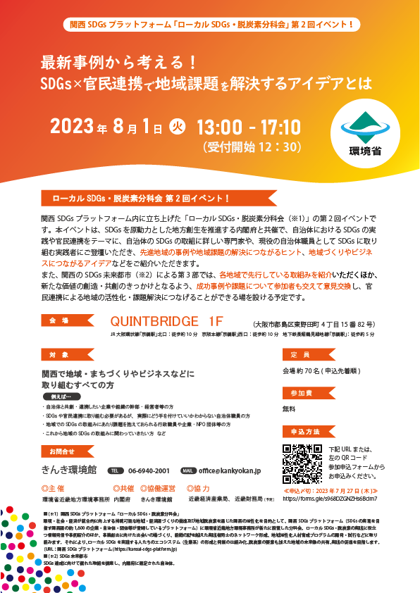 この度、環境省は関西 SDGs プラットフォーム内の「ローカル SDGs・脱炭素分科会」の第2回イベントを開催します。