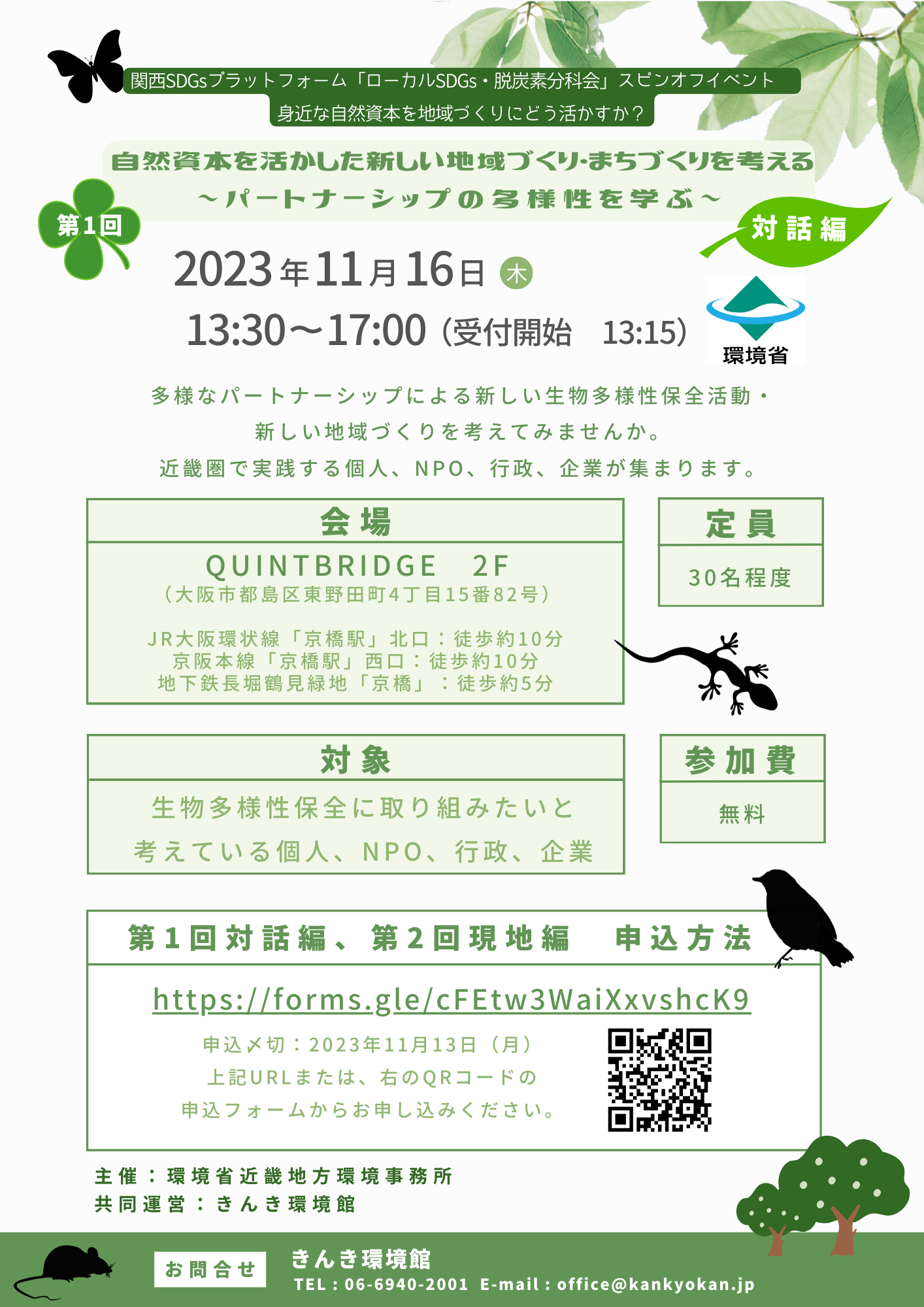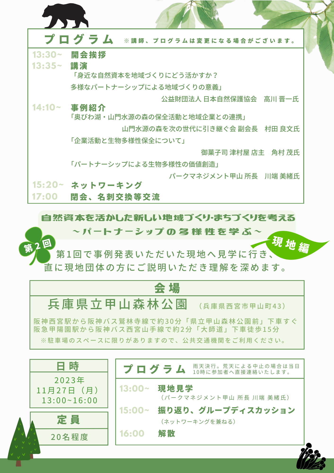 生物多様性保全と自然資本の活用をテーマに、第1回(対話編)では、専門家や実践者の皆さんにご登壇いただき、自然資本を活かした新しい地域づくり・まちづくりの中でも、特にパートナーシップに関する最新情報や企業による取組事例をお話しいただきます。第2回(現地編)では、第1回の登壇者のうち兵庫県立甲山森林公園へ直接お伺いし、より理解を深めます。
