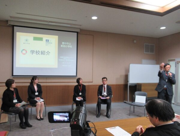 地球温暖化防止全国ネット理事長の高田研氏に進行をお願いし、ユネスコスクールとしてたくさんの実践を行う豊中市立新田小学校と、気候変動に関する授業に継続して取り組む堺市立日置荘小学校の事例について各小学校からお話いただきました。